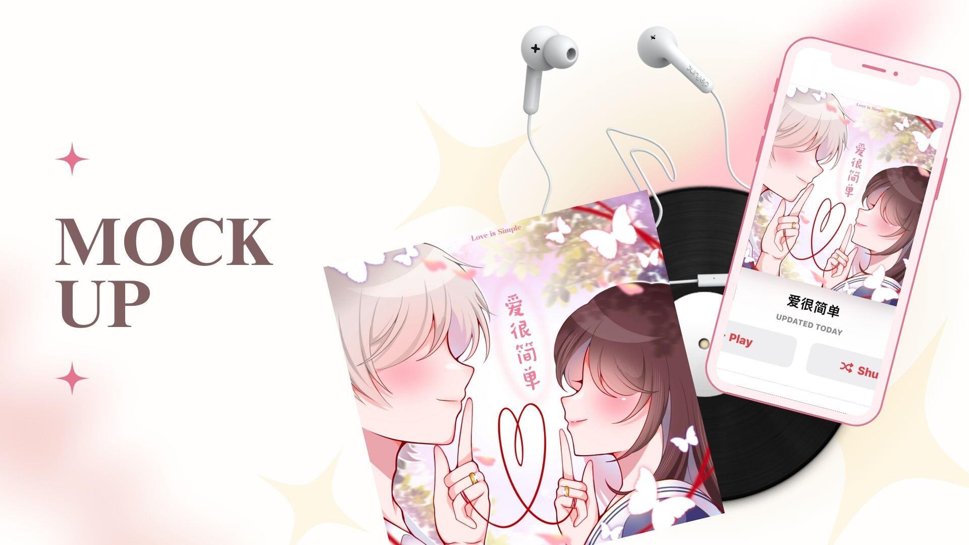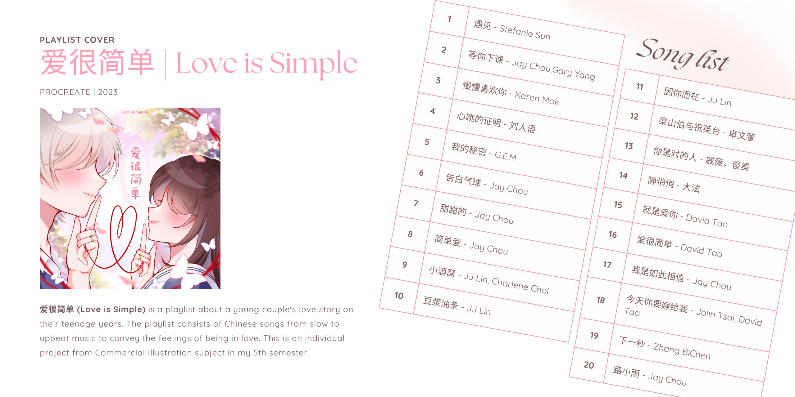 爱很简单 (Love is Simple) is a playlist about a young couple's love story on their teenage years. The playlist consists of Chinese songs from slow to upbeat music to convey the feelings of being in love. This is an individual project from Commercial Illustration subject in my 5th semester.