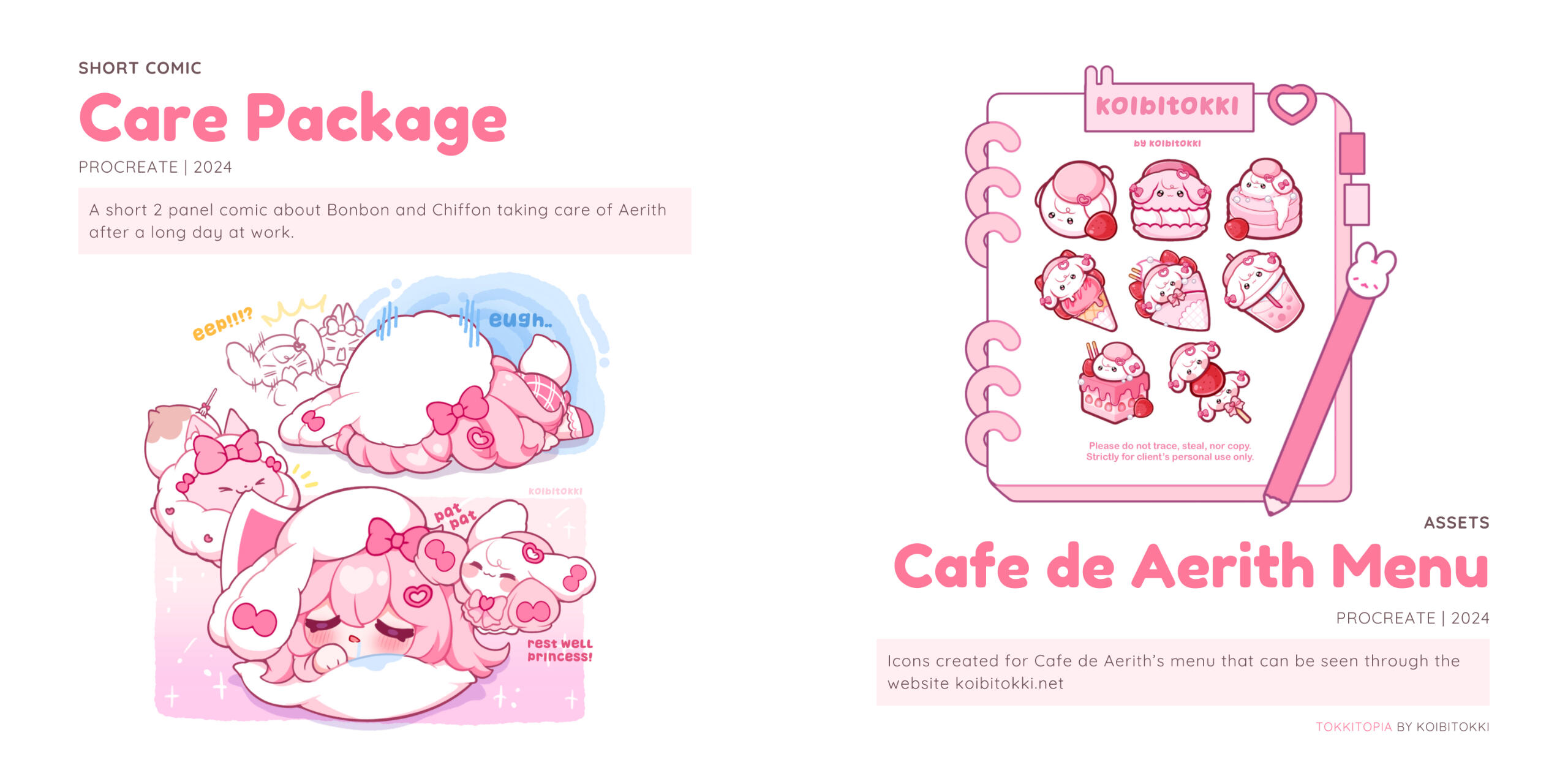 This is an on going project starring Aerith, Bonbon and Chiffon. They will be the main stars to help promote Koibitokki as an illustration studio and strengthen the brand itself through various medias like short comics, animations, illustrations, and merchandises.Contents are about Aerith. Bonbon and Chiffon’s daily lives in the Chateau as a freelance illustrator and streamer.